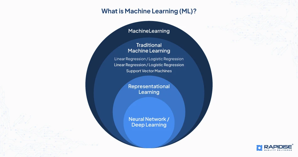 Machine Learning serves as an Artificial Intelligence (AI) subsection where computers acquire knowledge patterns through unprogrammed data processing to make decisions or form predictions. Machine learning operates differently than rule-based programs because it enhances itself through data evaluation to produce better outputs.