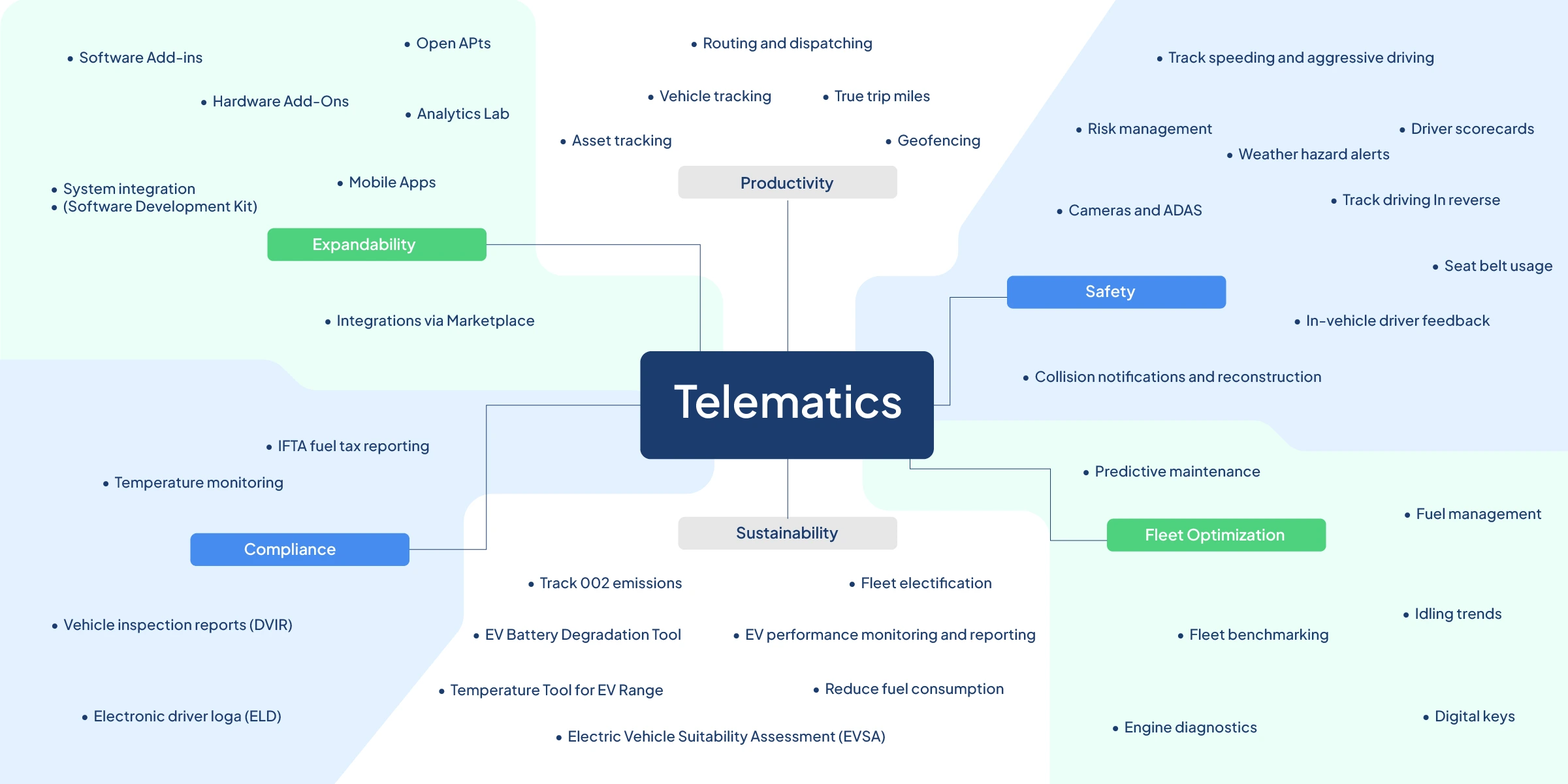 The coordination of operations for a fleet requires good communication. Current telematics systems may include communications facilities, through which managers can communicate with drivers in real time. These systems support both messages that are sent from managers with route updates, safety messages, or schedule changes to the drivers.