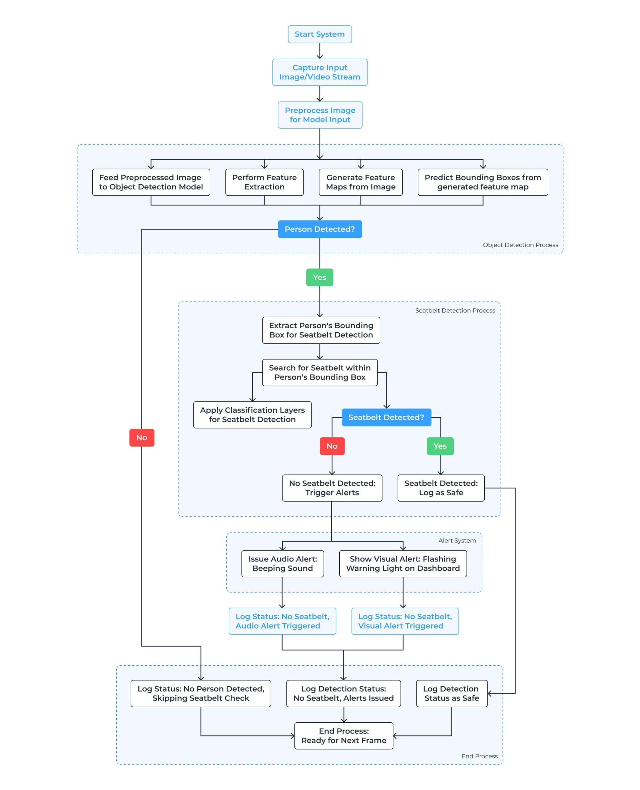 Performs a targeted search within the detected person's bounding box to identify seatbelt presence accurately.