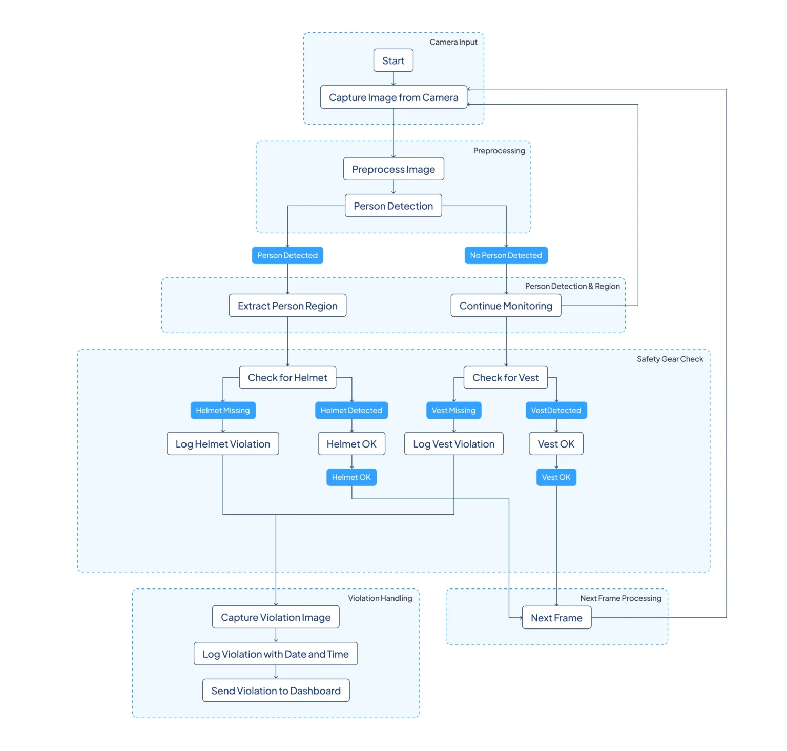 Uses advanced algorithms such as SSD Mobilenet for accurate and instantaneous detection of safety gear.