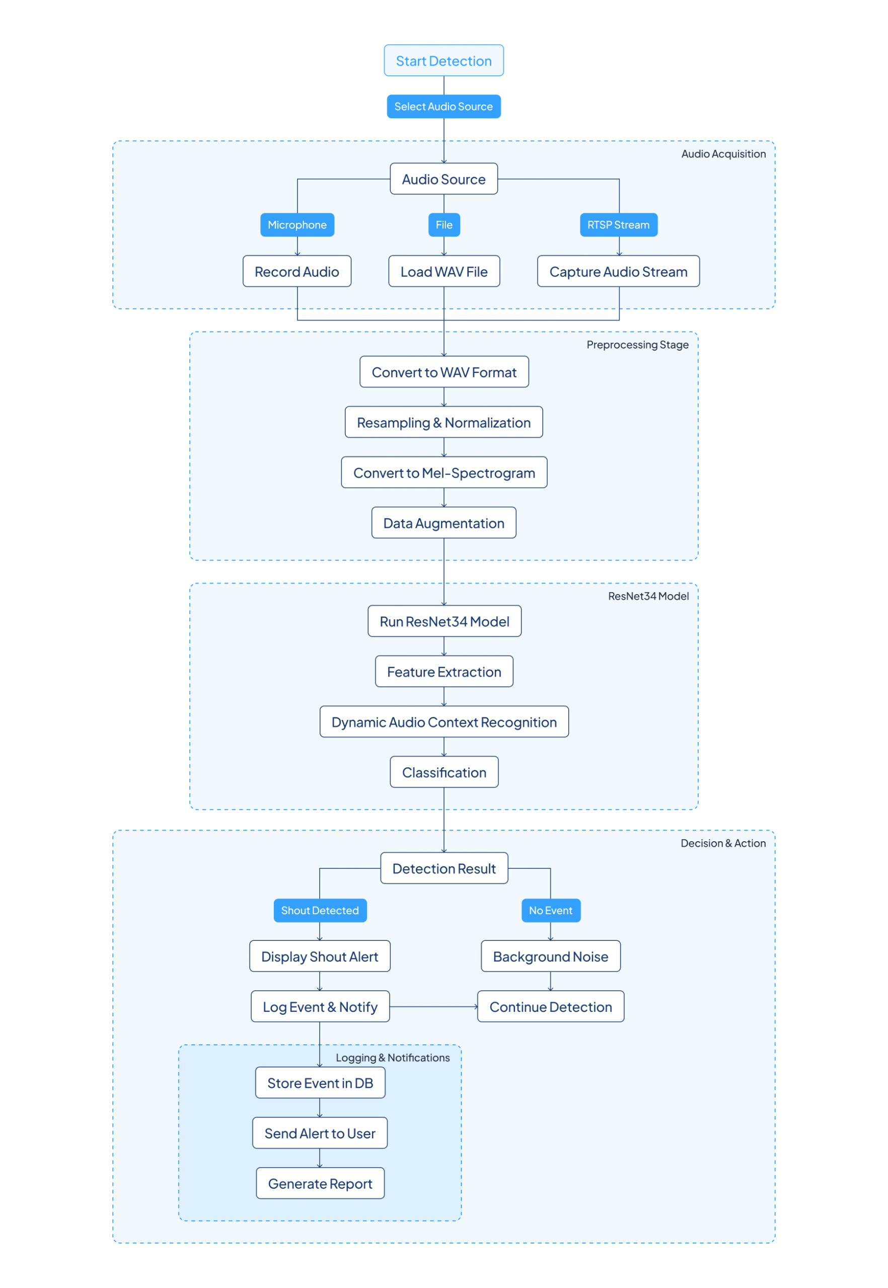 The Shout Detection System has a structured architecture that integrates audio preprocessing, deep learning-based feature extraction, and real-time classification.