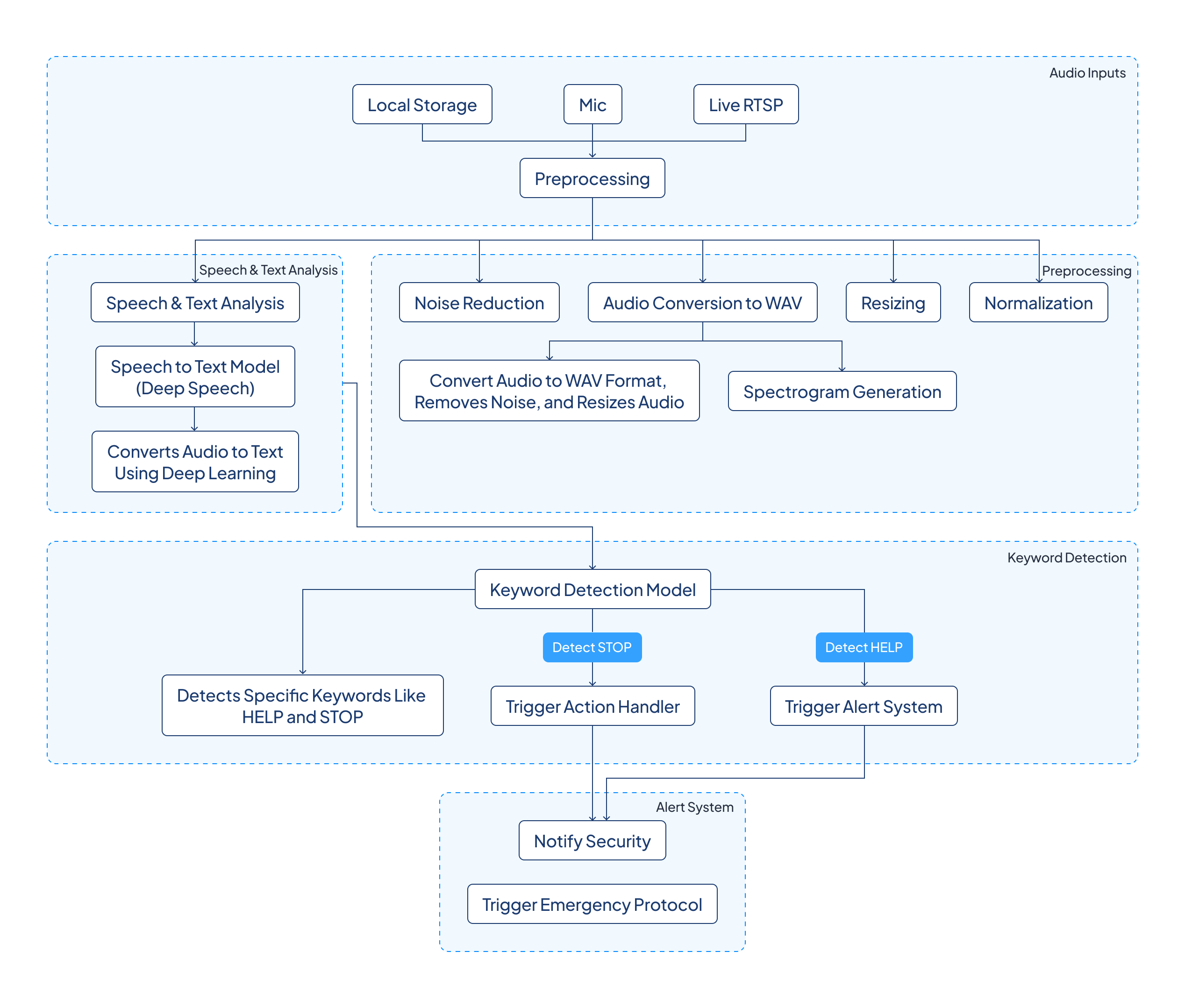 The Telep Word Spotting Solution is designed with a multi-stage architecture that assures precise, real-time voice command recognition while optimizing computational efficiency and safety.
