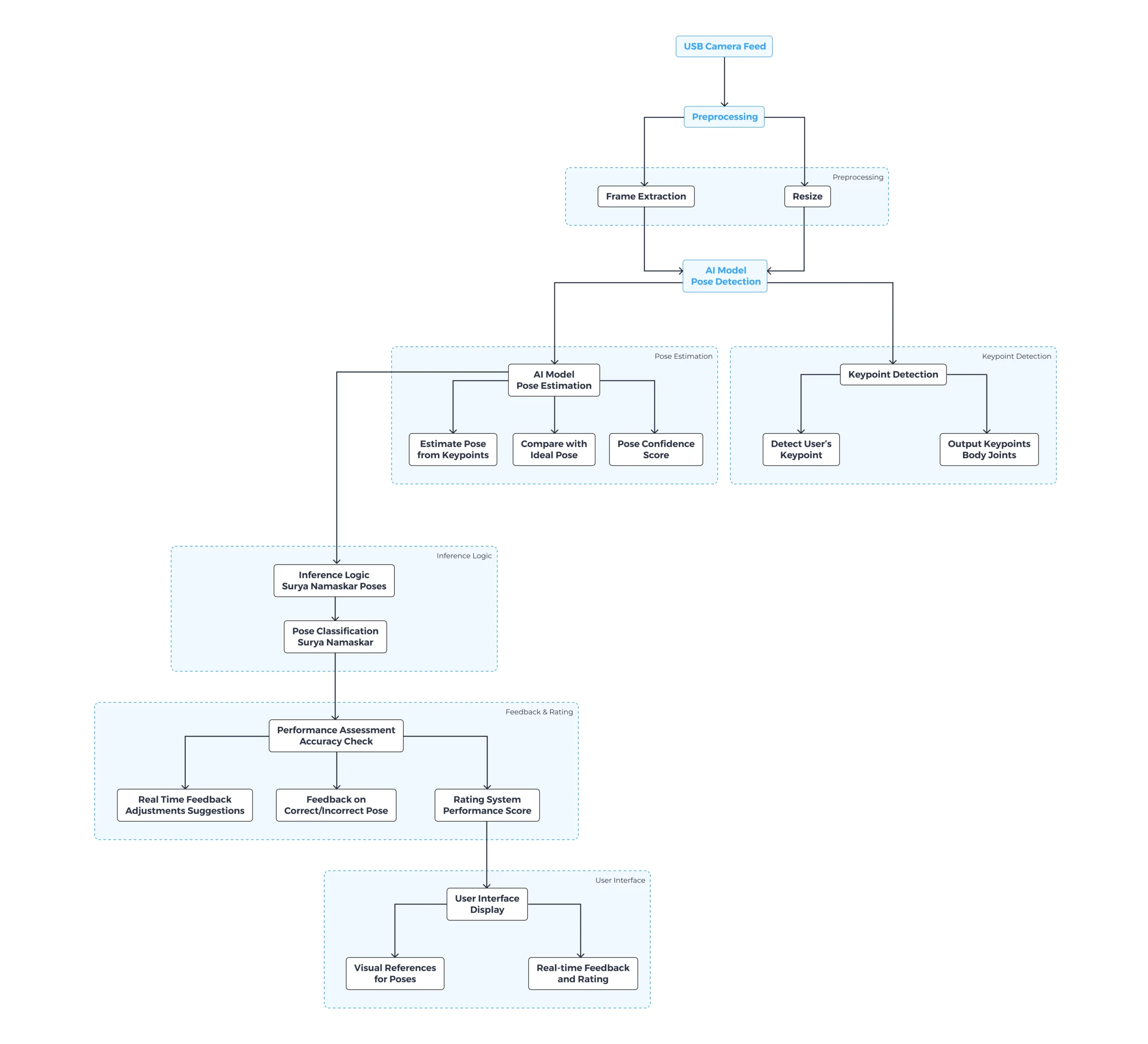 Rapidise Telep Yoga Instructor utilizes advanced AI and pose estimation technology to revolutionize yoga practice. It captures real-time video through a USB-connected camera, processes the feed into discrete frames, and adjusts dimensions using image resizing algorithms for seamless AI model integration. By detecting body joints as (x, y) coordinates with ML Kit or PoseNet, skeletal representations are created for precise pose analysis. The system classifies poses using machine learning algorithms, compares them against reference templates with distance metrics, and assigns confidence scores for accuracy.
